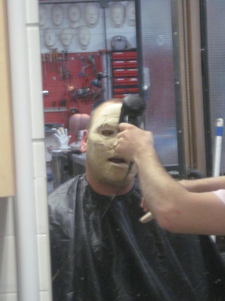 In order to get the eyes and lips to stick to the mask Erik uses a blowdryer.